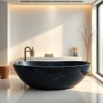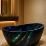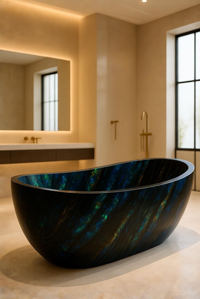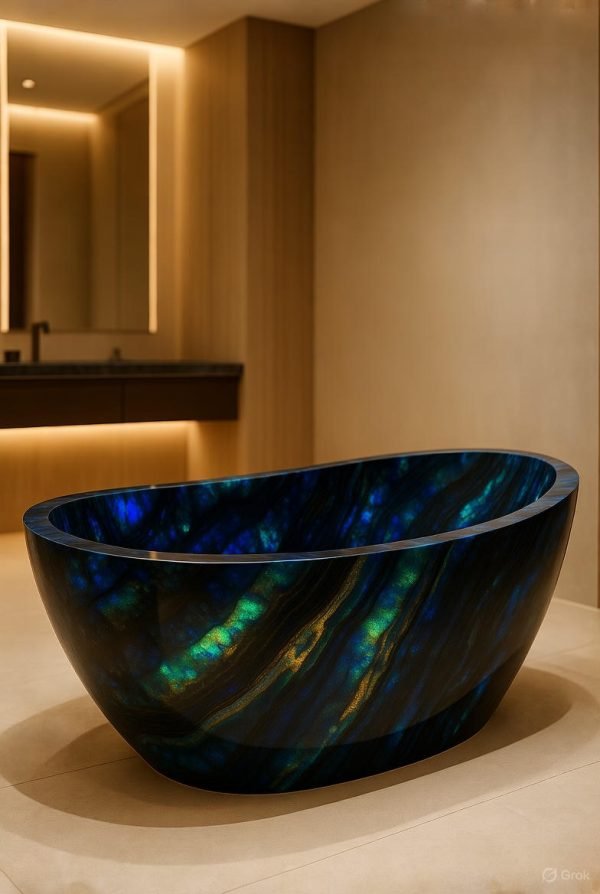 Our Black Opal Bathtubs redefine luxury bathing. Each freestanding tub is sculpted from premium semi-precious Black Opal stone, featuring a deep dark base enriched with iridescent flashes of blue, green, and gold. This extraordinary piece transforms ordinary bathrooms into spa-like sanctuaries, offering both stunning aesthetics and enduring quality.