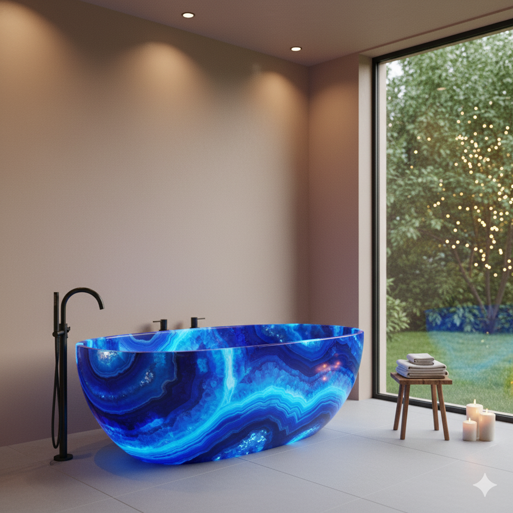 Blue Agate is a semi-precious stone celebrated for its vibrant shades of blue and distinctive concentric banding. Known for its calming energy and striking translucency, it is ideal for backlit or spotlighted installations. Every bathtub is one-of-a-kind, displaying unique patterns and colors that make each piece a functional work of art.