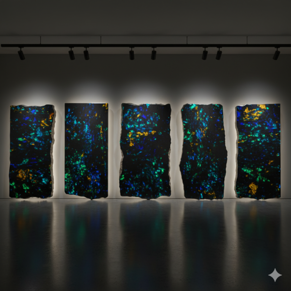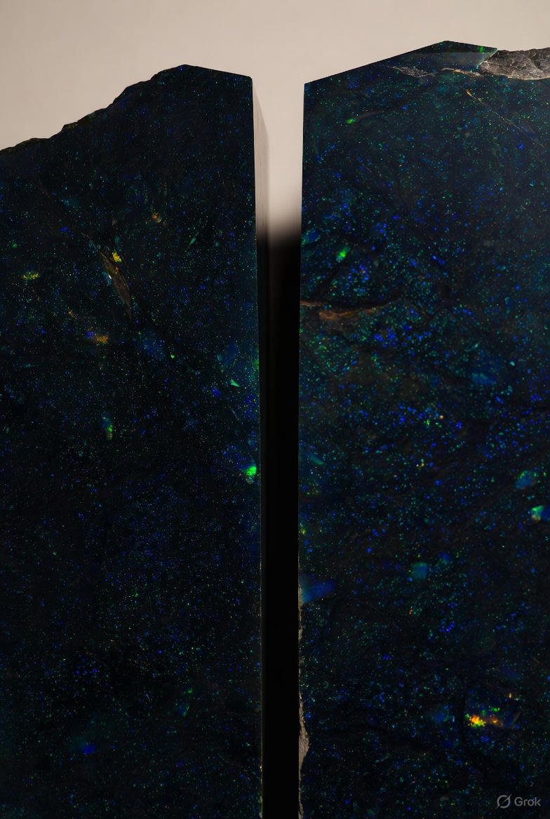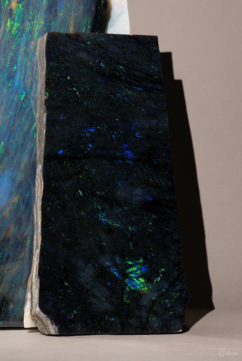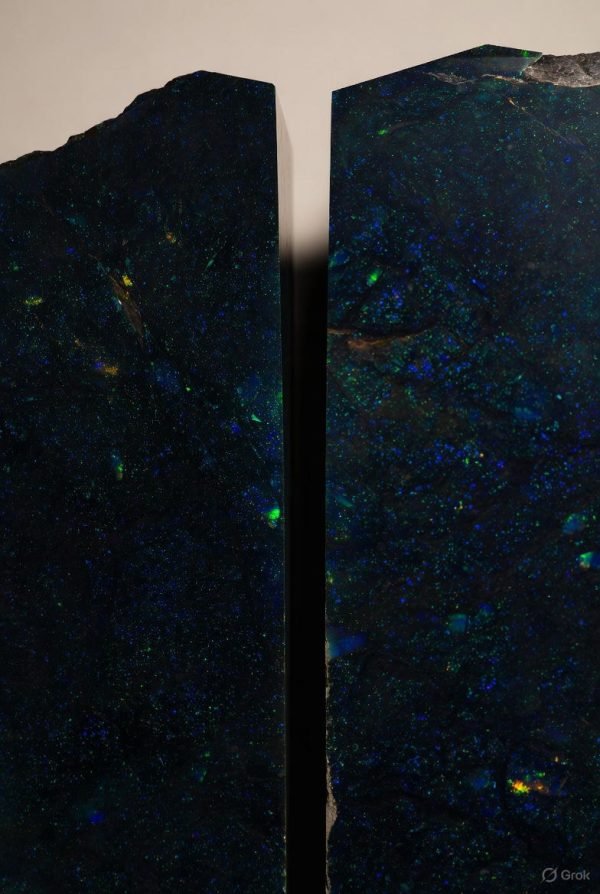 Our Black Opal Slabs offer an unmatched blend of mystery and elegance. With their deep, dark base enhanced by iridescent flashes of blue, green and gold, these semi-precious stone slabs are ideal for creating striking feature walls, countertops, tabletops and custom furniture pieces. Each slab is meticulously cut and polished to reveal the opal’s natural beauty, making it perfect for high-end residential and commercial spaces.