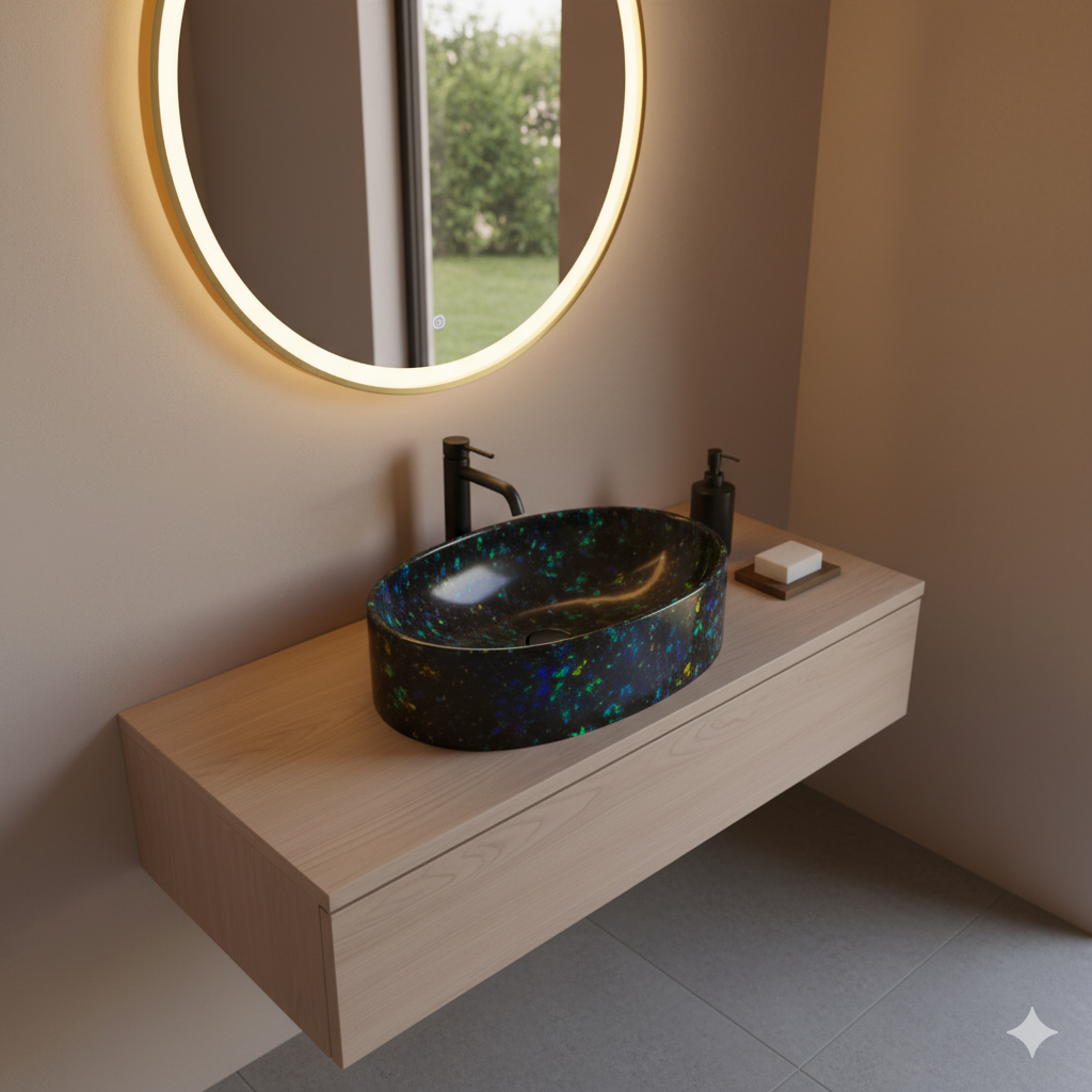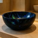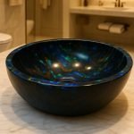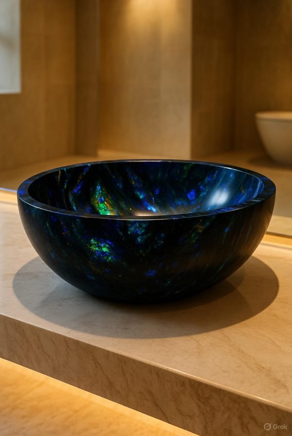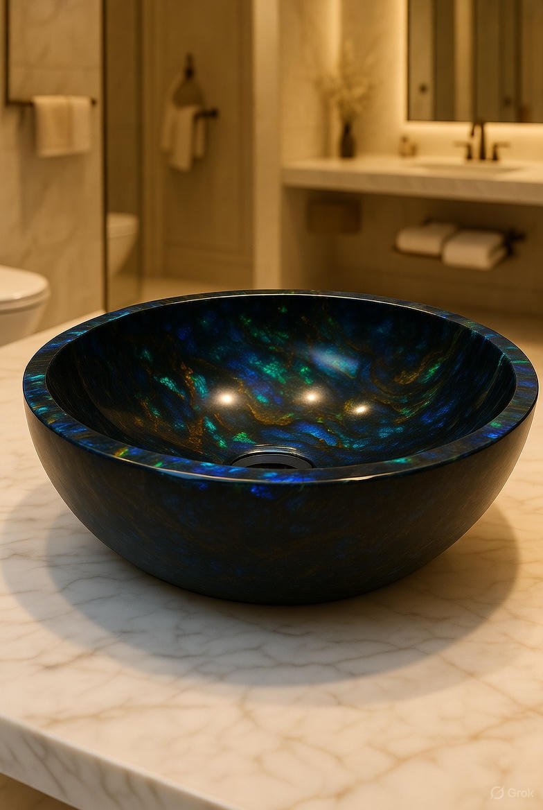 Our Black Opal Wash Basins are designed to be a statement of sophistication and artistry. Each basin is handcrafted from premium semi-precious Black Opal stone, showcasing a deep dark base enhanced by iridescent flashes of blue, green, and gold. Perfect for luxury bathrooms, powder rooms and boutique spaces, these basins add a dramatic focal point while offering long-lasting performance.